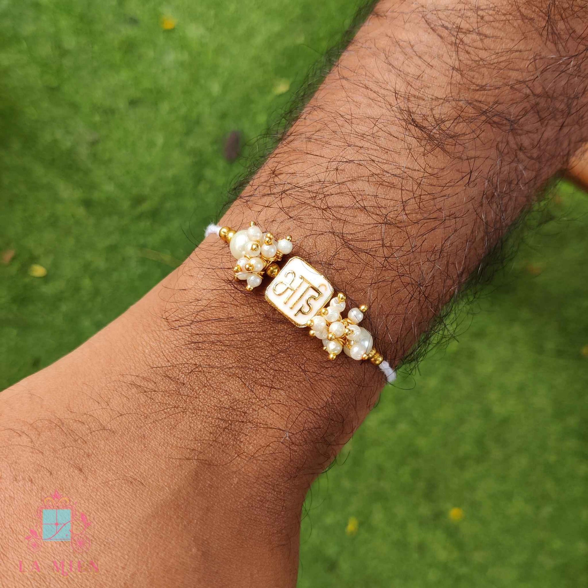Celebrate Raksha Bandhan 2025 with this beautifully handcrafted Bhai Rakhi, featuring “भाई” elegantly inscribed in Devanagari script. A perfect combination of tradition and style, this rakhi is adorned with shimmering kundan stones, delicate pearl beads. Available in two color variants - pink and white, both the thread and the central charm are color-coordinated to offer a unique festive look.